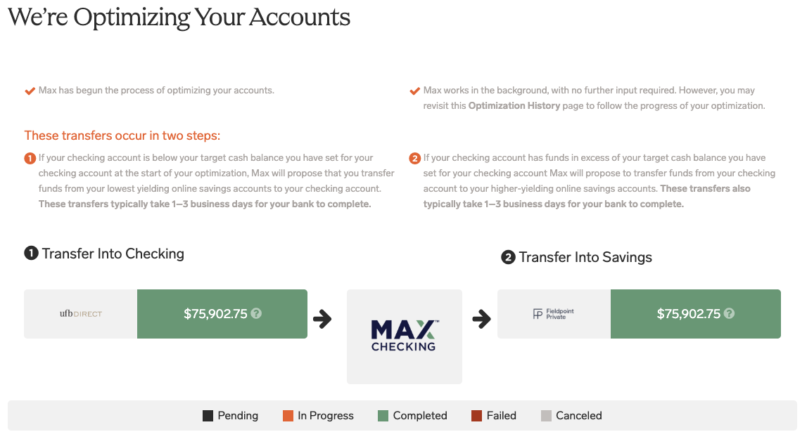 Max is designed to help you maximize the interest that you earn while staying fully FDIC-insured. The process of helping you optimally reallocate your cash among your accounts is called an optimization.