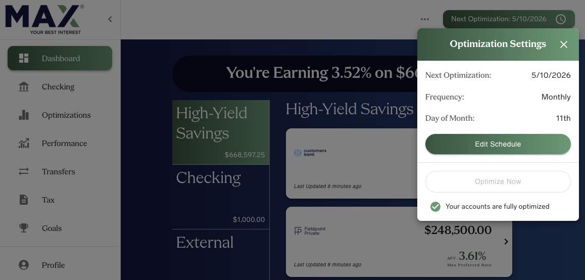 While there may be some reduction in the interest that you earn for the day that funds sit in your checking account, we calculate that for most Max members, the impact over the course of a year is typically just a few basis points. As a result, the impact -- while non-zero -- is negligible, and is typically more than made up for by the greater interest that you will earn by optimizing.